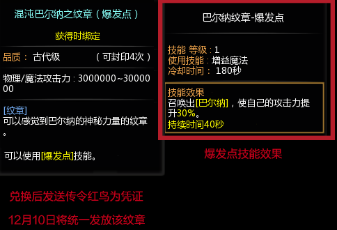 4.混沌巴尔纳之纹章(爆发点)兑换后将发送【传令红鸟*1】作为凭证,12月10日将统一发放该纹章,请耐心等待。