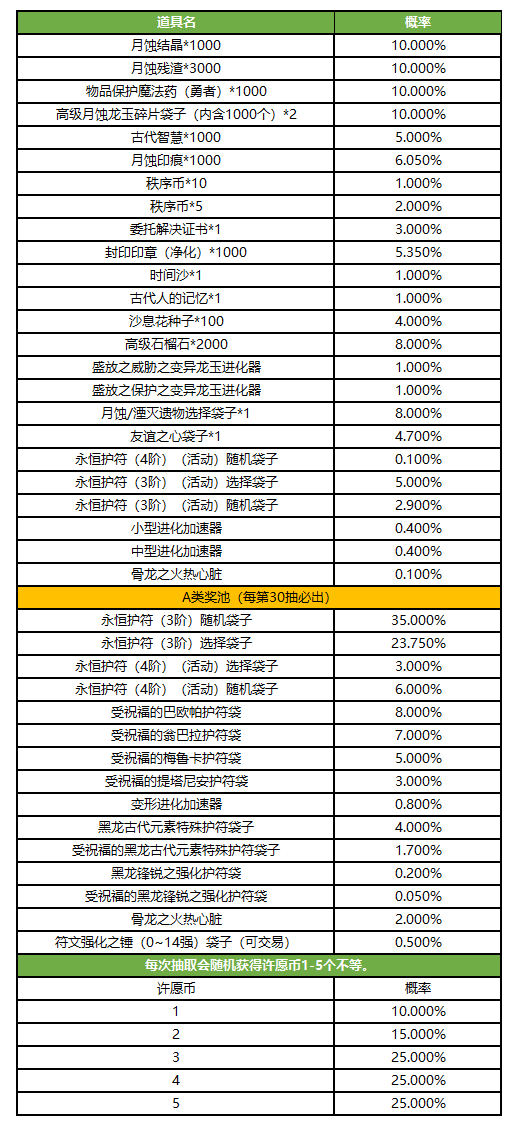 在本活动页面,使用1000点券,购买50个【月蚀印痕】,获赠1次许愿次数,【账号限购10000个】;