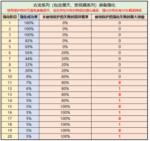 +1~+10必定成功,+11~+20概率成功,失败后物品损坏消失,使用【耀眼的物品保护魔法药】后强化失败物品归零。